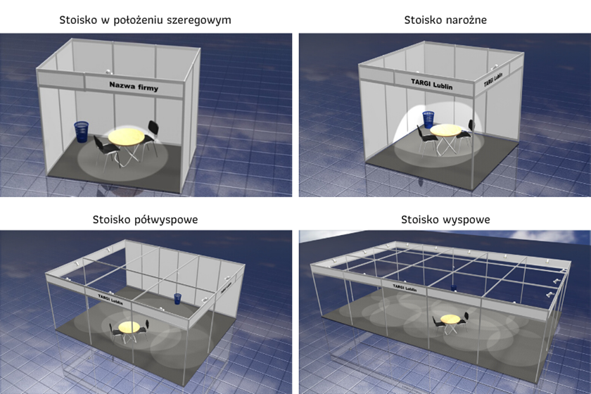 Przykładowe wizualizacje stoisk w standardowej zabudowie